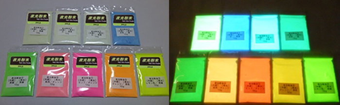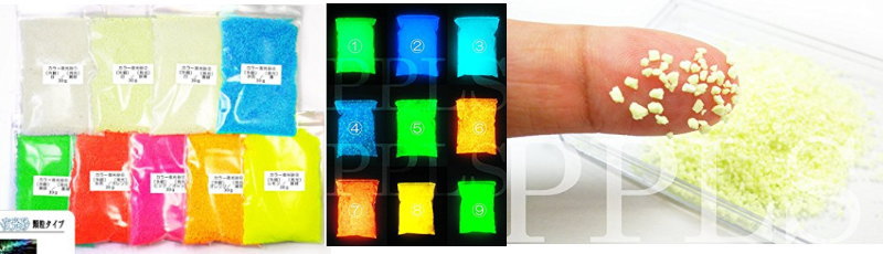 PPLSブランド 夜光粉末は、無着色→黄緑・青緑・青色へ発光する3商品に顔料添加商品を加えた9種類とアソートタイプの品ぞろえをご用意いたしています。