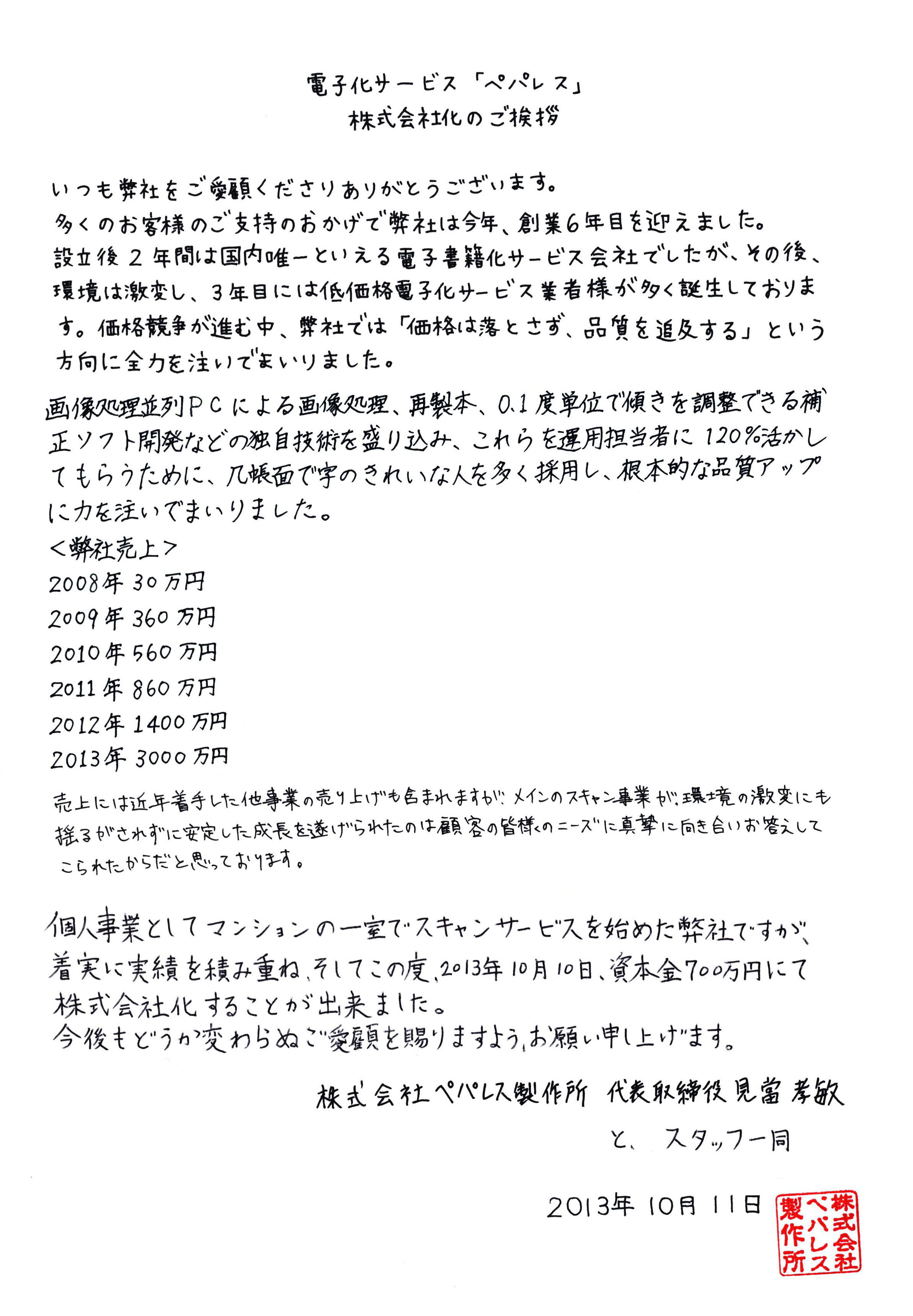 | 沿革 | 2008年8月 たりお企画を創業し、電子化サービスペパレスを運営開始 2012年5月 PPLS商品を販売開始 2013年10月 株式会社ペパレス製作所(資本金700万円)を設立 株式会社化のご挨拶 2014年4月 株式会社ペパレス第二製作所(資本金600万円)を設立し、物販事業を分社しました。 2015年9月 事業規模拡大に伴い、PPLS本社ビルに事務所移転を致しました。 |
