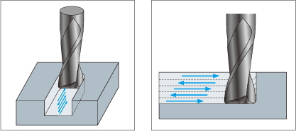 3枚刃のエンドミルは、2枚刃、4枚刃中間の特長を併せ持っており、側面、溝加工両方に対応しています。