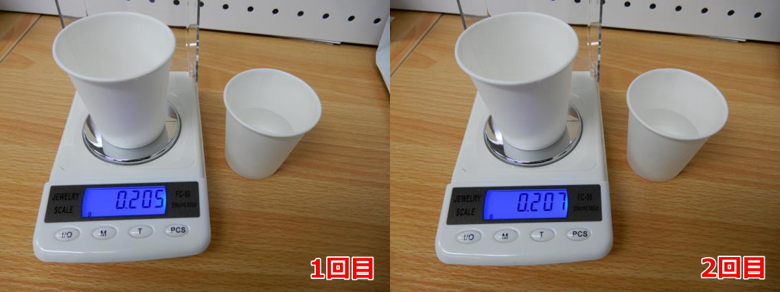 吸い取った水を測ってみると、1回目は「0.205g」2回目は「0.207g」誤差は2.5%です。