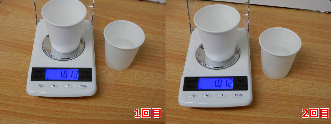吸い取った水を測ってみると、1回目は「1.013g」2回目は「1.012g」誤差は1.3%です。