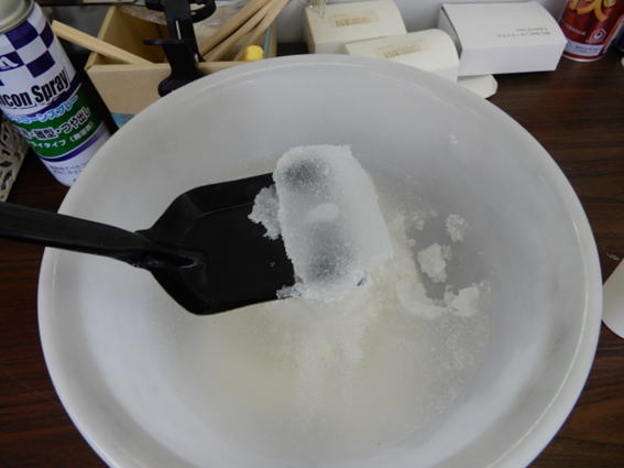拭きにくい場所にこぼしてしまった水にこのポリマーをかければ、写真のようにみるみるうちに水分を吸って固まっていきます。